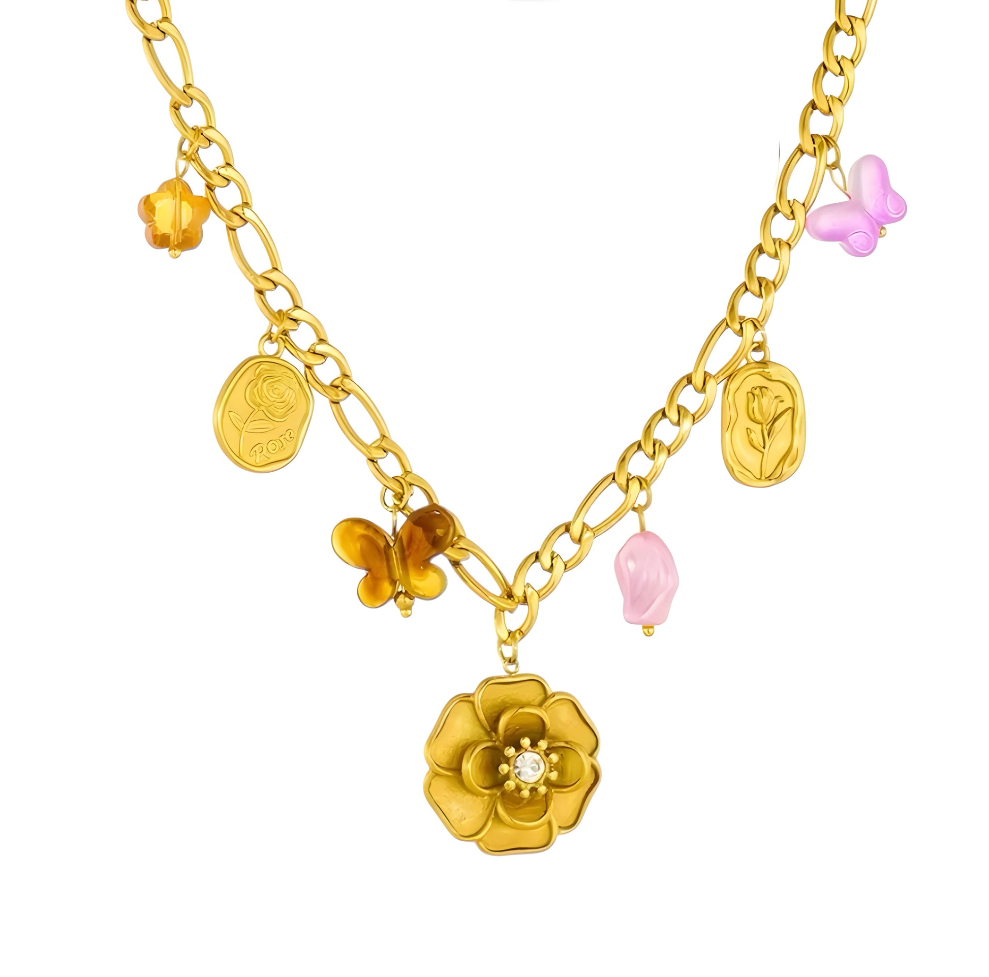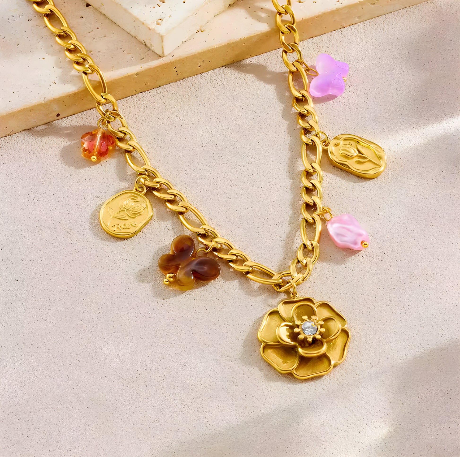 Collier en acier inoxydable doré, orné de pendentifs délicats et colorés qui ajoutent une touche ludique et élégante à votre style. Ce bijou unique allie modernité et charme intemporel, idéal pour sublimer vos tenues du quotidien ou vos looks de soirée. Sa finition de qualité garantit une résistance à l'usure tout en conservant son éclat.